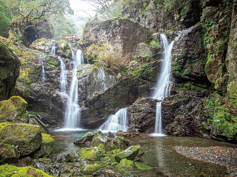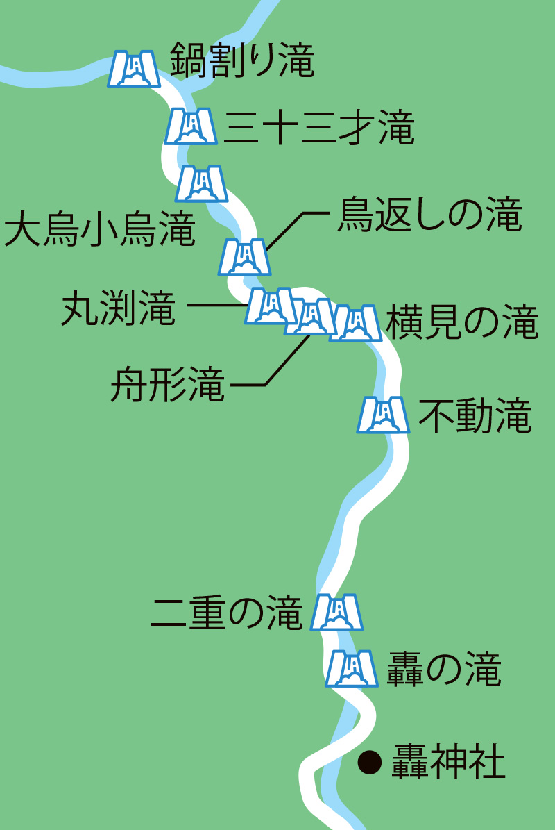 轟神社の周りにある滝の総称。最下流の轟の滝に始まり、上流に向けて二重の滝や横見の滝など趣のある大小さまざまの滝が連続し、山全体が滝の回廊のよう。