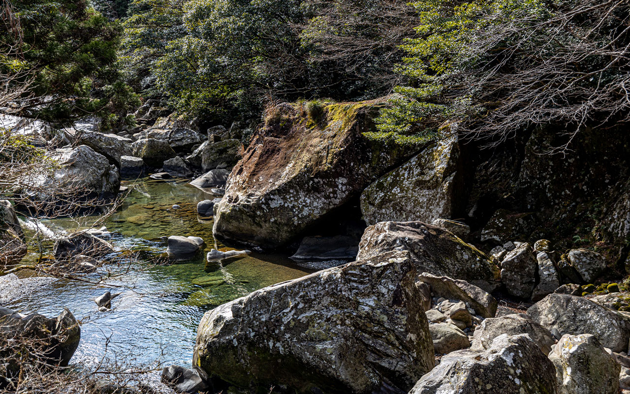 静かな山道を進んでいくと、美しく透き通る川の水。春は土手に咲く桜、初夏は川遊び、夏から秋にかけては鮎釣りなどもでき、どの季節も魅力いっぱいです。
