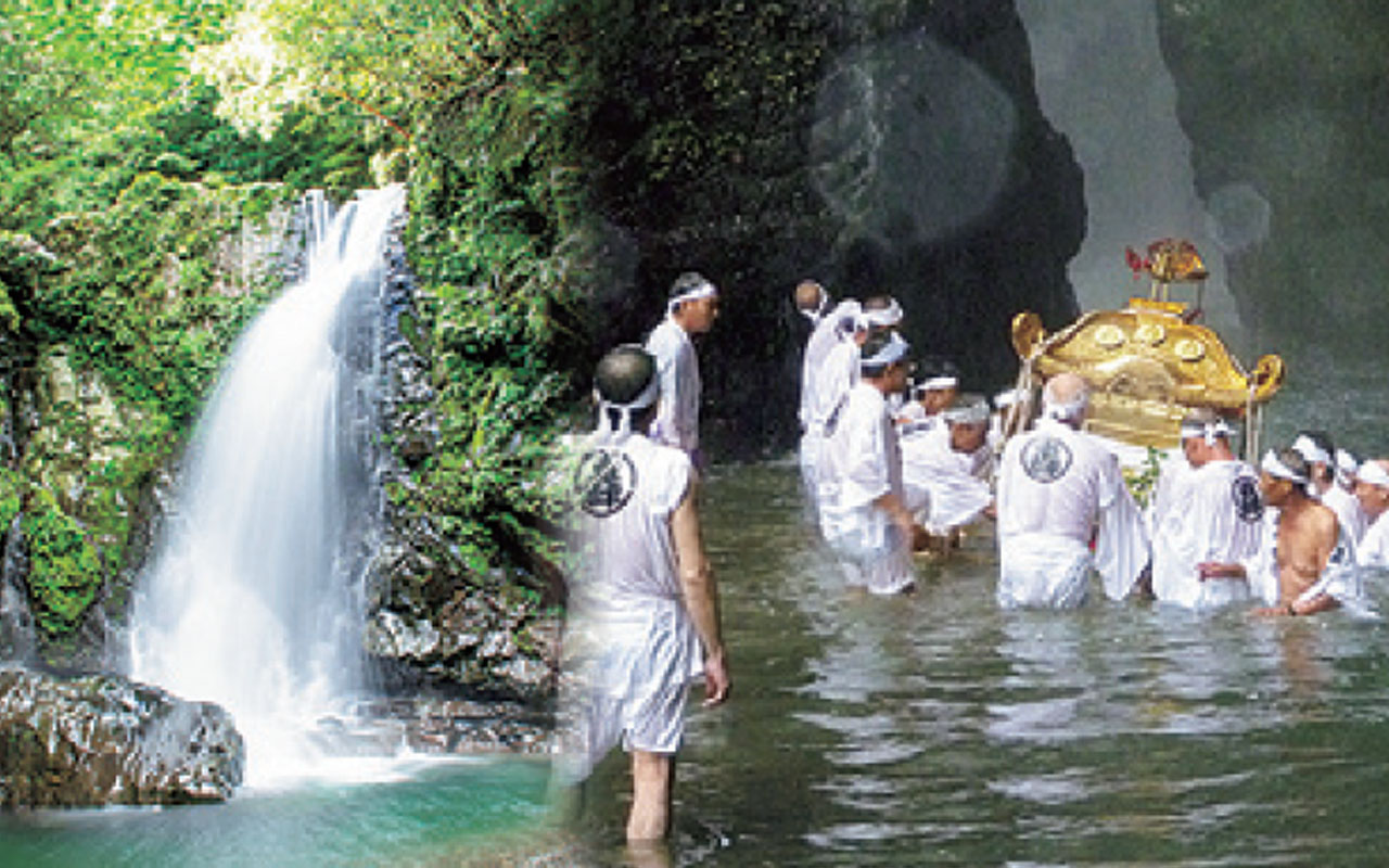 轟の滝をご神体とする轟神社で毎年11月第2日曜に行われる例大祭。白装束の男たちが担ぐ暴れ神輿が神社の急な140段の石段を駆け下り、轟の滝の滝壷に入っていく滝渡御は勇壮で迫力満点です。